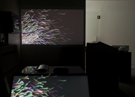 김준서_Void Loop, 2025, 프로젝터, 나무, bldc 모터, 쇠구슬, 마이크, PC, 제너러티브 파티클