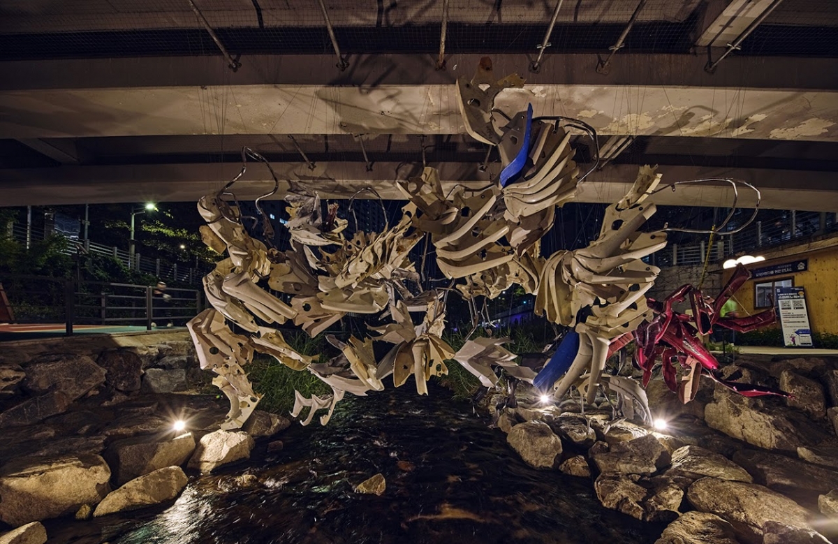 오민수는 첨단사회의 눈부심 속에 은폐된 노동의 문제에 천착한다. 작가의 인식은 사람들 곁에 기계가 실존하고 있으며, 어려움에 처한 사람들이 기계와 공존하지 않고는 생존하기 어려운 일종의 아이러니로부터 출발한다. 노동자와 기계와의 기이한 공생관계를 조명해 온 일련의 작업을 통해 오민수는 기계의 동물적 위협과 노동의 실존적 소실을 거울구조로 다루어왔다. 주체로 떠오른 기계의 ‘영혼’에 대한 관심은 사회의 어둡고 낮은 곳을 응시하는 작가의 시선 안에서 생경한 감각으로 전이되어 나타난다. 매일 새로운 기술이 홍수처럼 밀려드는 시대, 문명의 수면 위로 올라타야만 우리는 살아남을 수 있다. 그러나 오민수는 수면 위가 아닌 아래를 바라본다. 홍수에 잠식해가는 이들에 대한 작가의 통찰을 느껴보기 바란다.