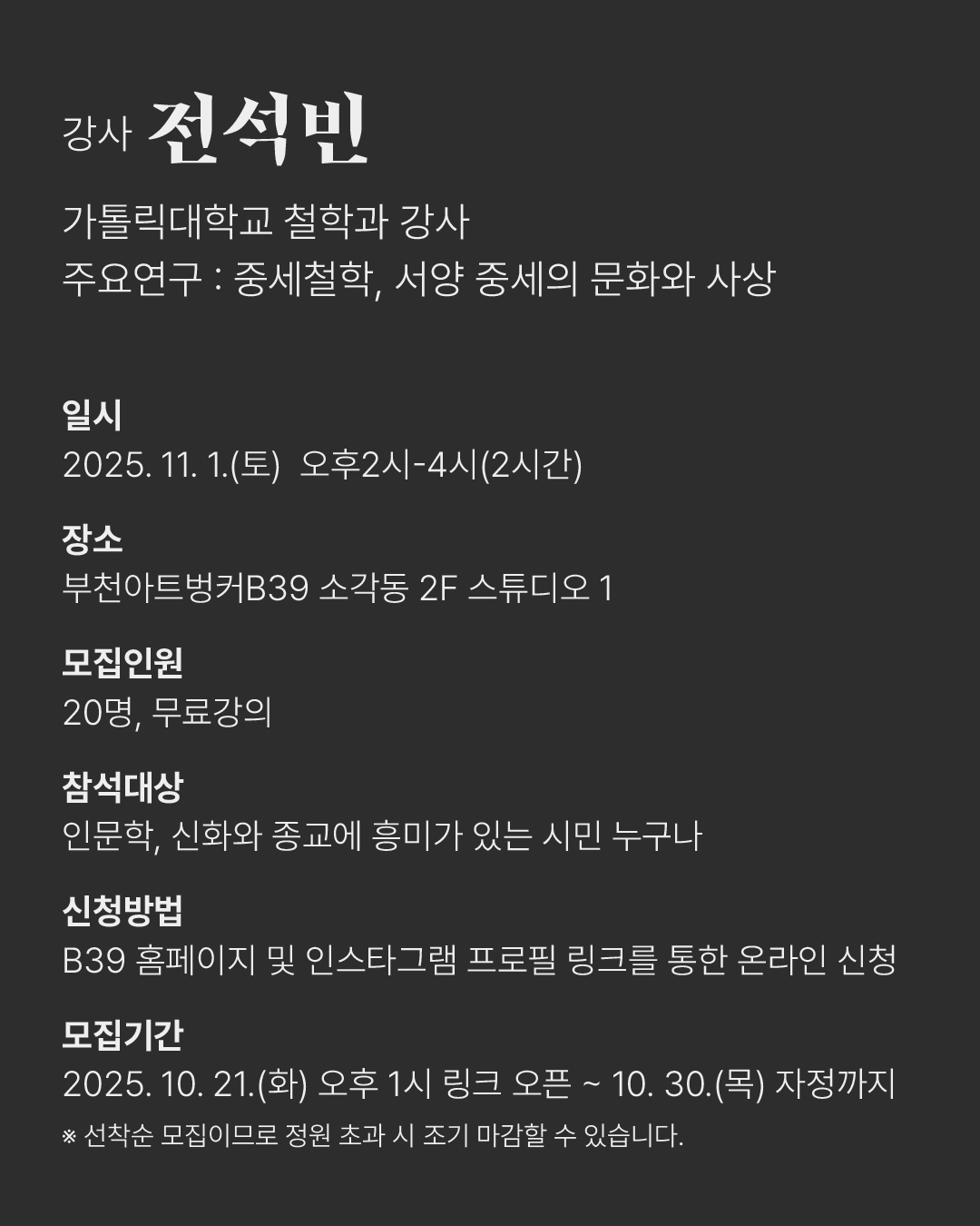 부천아트벙커 B39는 공학과 예술, 인문학 등 학문 간의 교류와 융합이 이뤄지는 다양한 교육 프로그램을 운영하고 있으며, 창의적 사고의 훈련과 개인의 예술적 잠재력 발견, 종합적인 창작 경험을 통한 모두의 건강한 삶을 지향합니다.